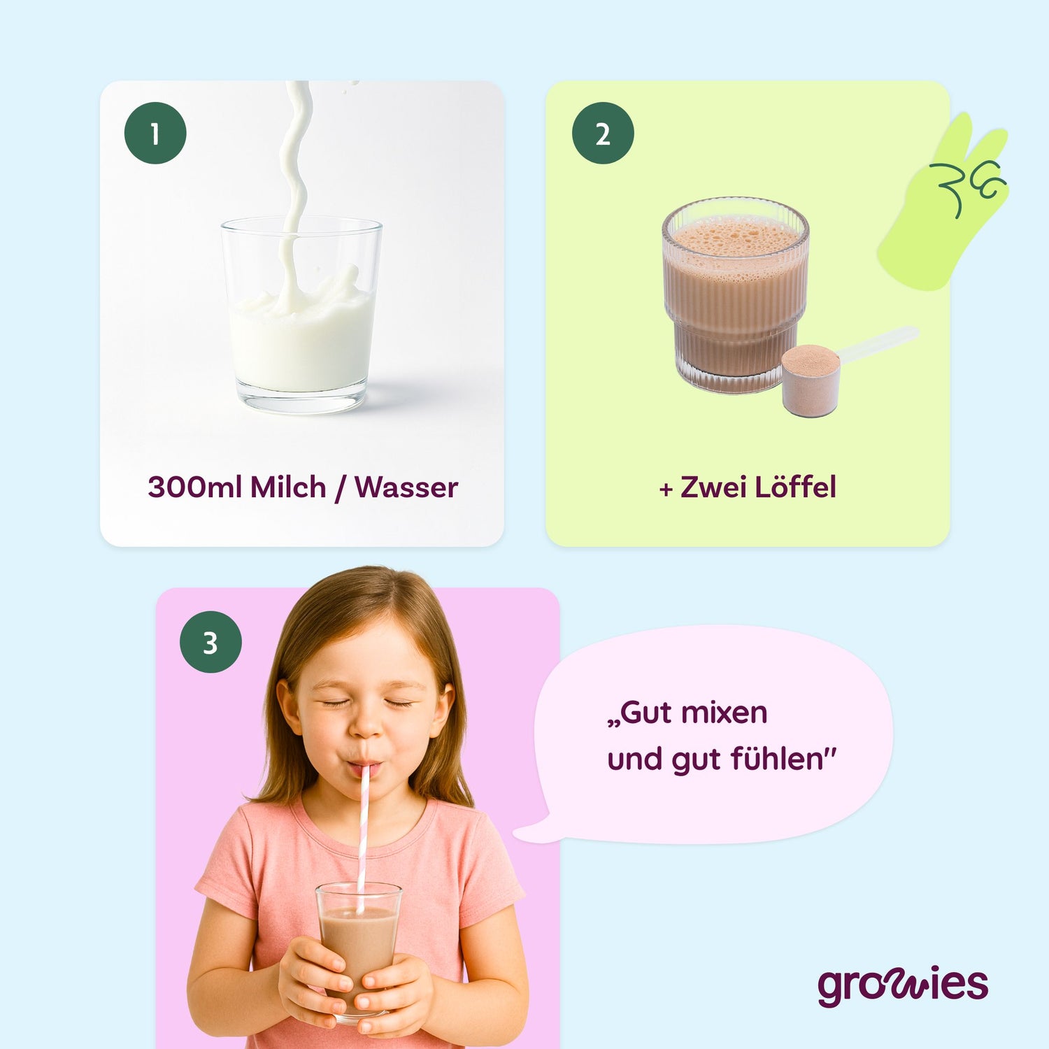 Der growies Shake ist in 30 Sekunden gemacht und versorgt Dein Kind mit allem, was es für seinen Tag braucht – ohne Zuckercrash, dafür mit wertvollen Nährstoffen für Wachstum, Konzentration & Co.