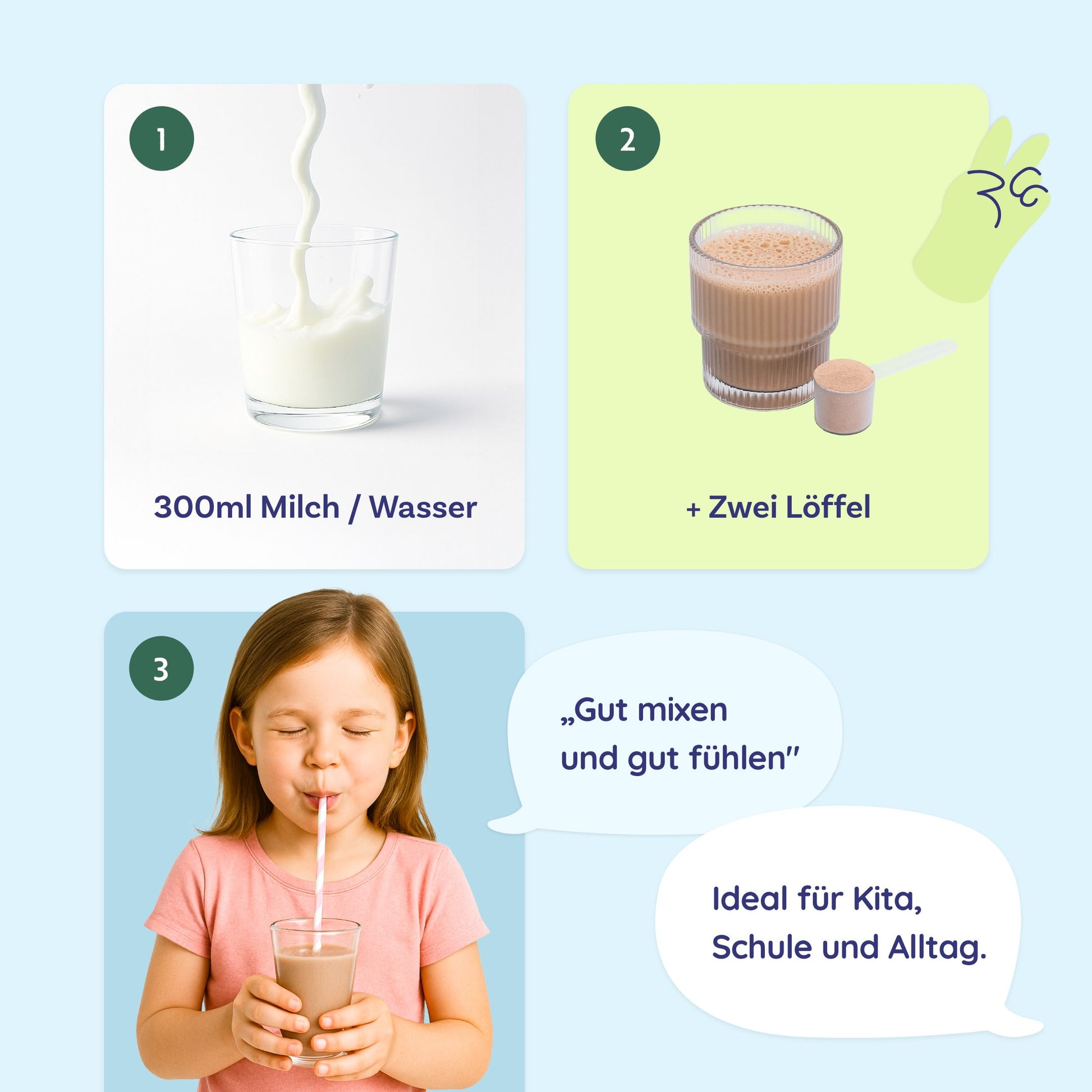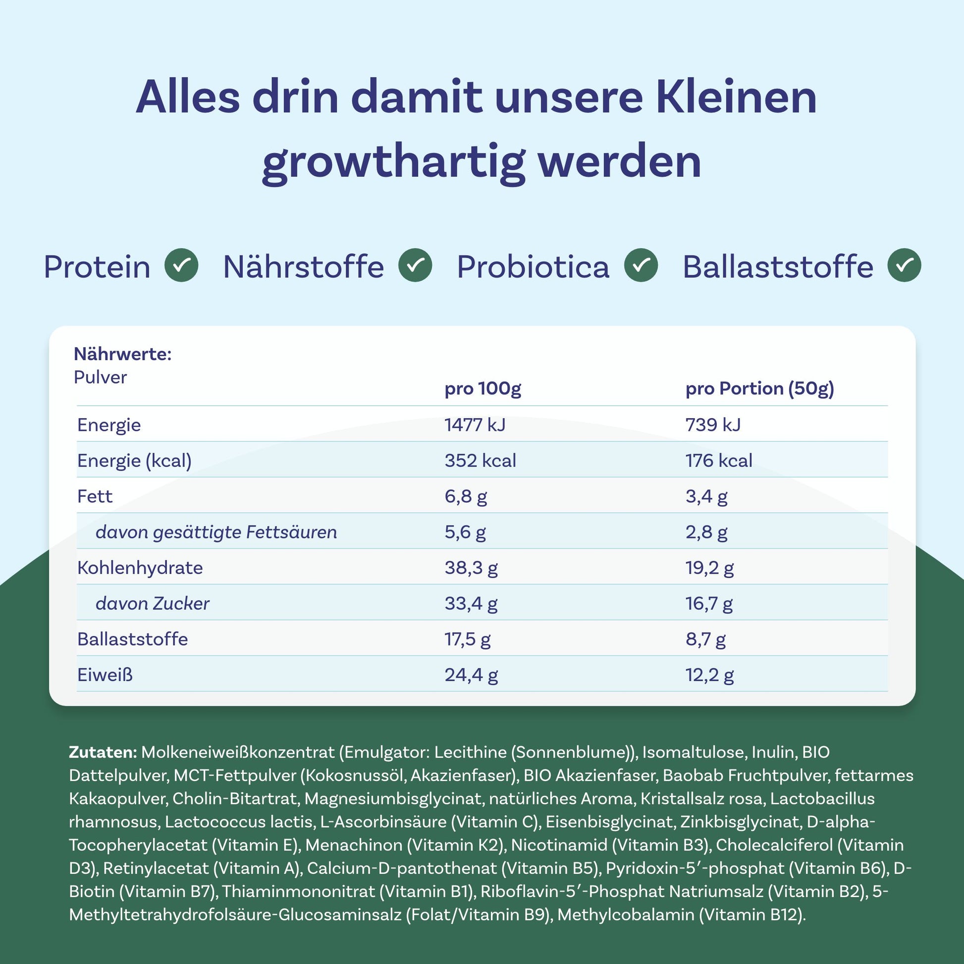 Zutaten: Molkeneiweißkonzentrat (Emulgator: Lecithine (Sonnenblume)), Isomaltulose, Inulin, BIO Dattelpulver, Verdickungsmittel: Gummi arabicum; MCT-Fettpulver (Kokosnussöl, Akazienfaser), Baobab Fruchtpulver, fettarmes Kakaopulver, Mönchsfrucht-Dekoktpulver, Cholin-Bitartrat, Magnesiumbisglycinat, natürliches Aroma, Calciumcitrat, Kristallsalz rosa, Lactobacillus rhamnosus, Lactococcus lactis, L-Ascorbinsäure, Eisenbisglycinat, Zinkbisglycinat, D-alpha-Tocopherylacetat, Menachinon, Nicotinamid, Cholecalciferol, Retinylacetat, Calcium-D-pantothenat, Pyridoxal-5'-phosphat, D-Biotin, Thiaminmononitrat, Riboflavin-5'-Phosphat Natriumsalz, 5-Methyltetrahydrofolsäure-Glucosaminsalz, Methylcobalamin.